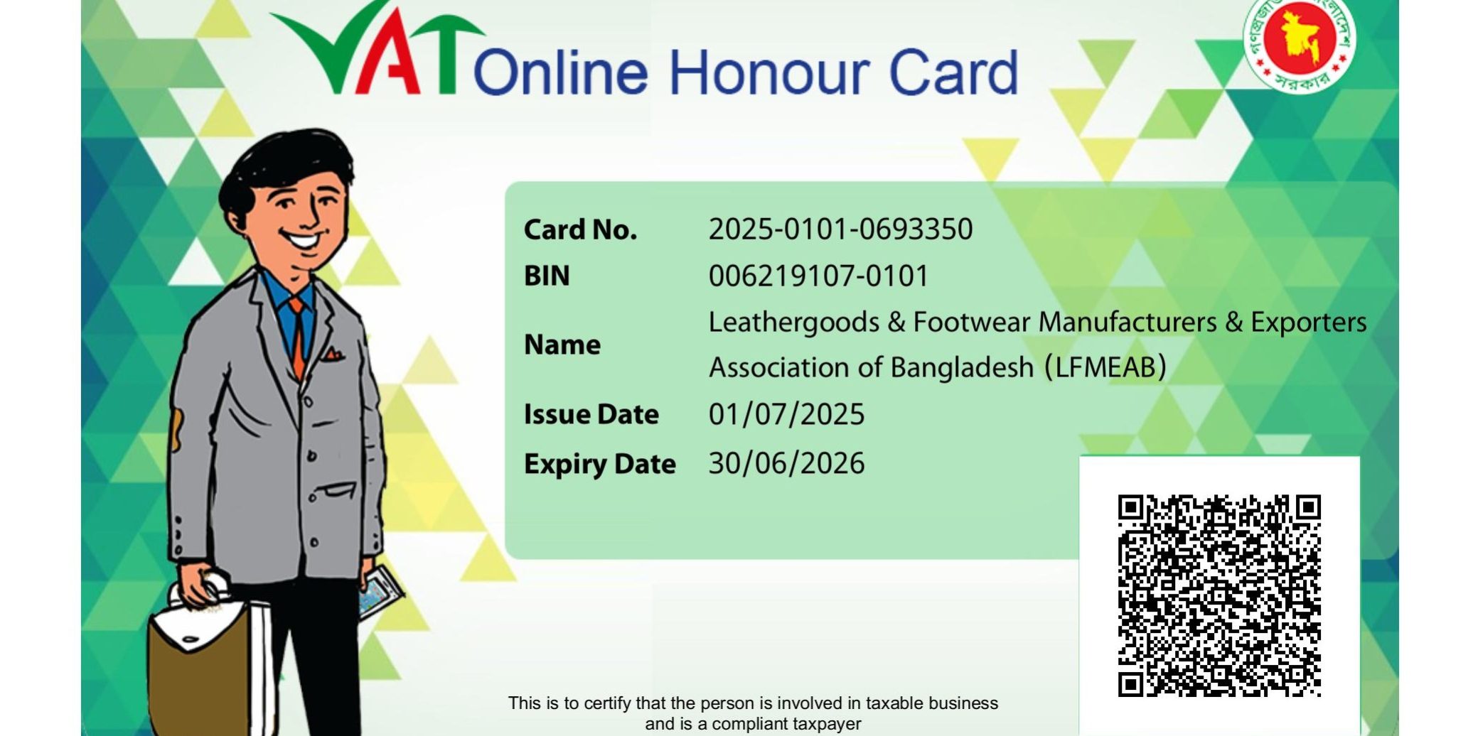 National Board of Revenue (NBR) awards LFMEAB with “VAT Honor Card” in recognition of maintaining a continuous record of VAT payment for 12 consecutive months. LFMEAB has been awarded the Honor Card in the very first year of VAT registration which stands as a significant achievement of the Association.